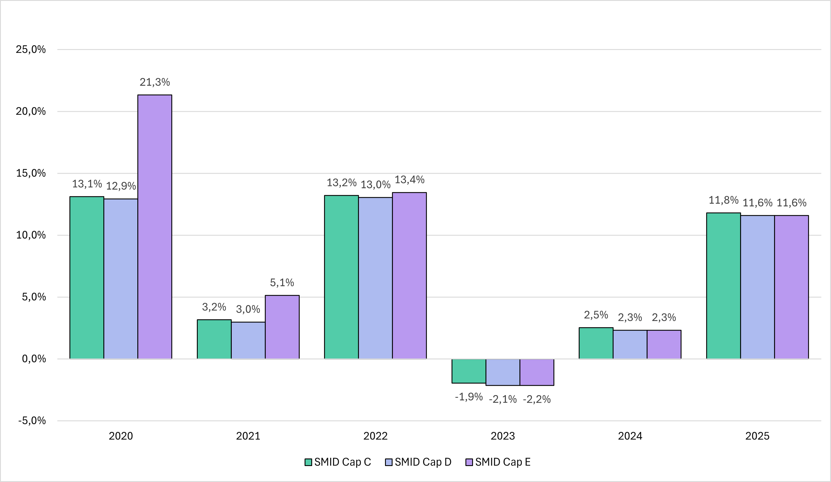 Detta diagram visar HealthInvest Small & Mid Cap Healthcare andelsklass C, D och E's resultat som förlust eller vinst i procent per år för de senaste fem åren. Ingen hänsyn är tagen till inflation.