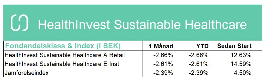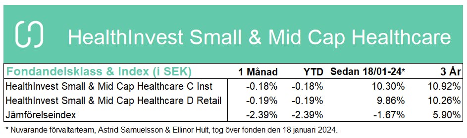 Vid månadens slut hade fonden 37 aktiepositioner. Fondens nettoexponering mot aktier var 97 %. Målsättningen för fonden är att investera i mindre hälsovårdsbolag med goda tillväxtmöjligheter.