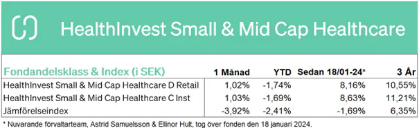 HealthInvest Small & Mid Cap Healthcare utvecklades positivt (1,02 %) i mars (Andelsklass D).