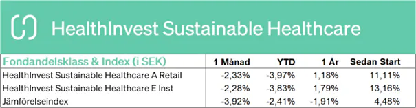 Fonden utvecklades negativt (-2,33 % för andelsklass A) i mars. För fonden var bioteknik bästa sektor, följt av vårdbolag i USA (sjukhus, läkemedelsdistribution) och tools. De sämsta bidragen kom från läkemedel och medicinteknik.