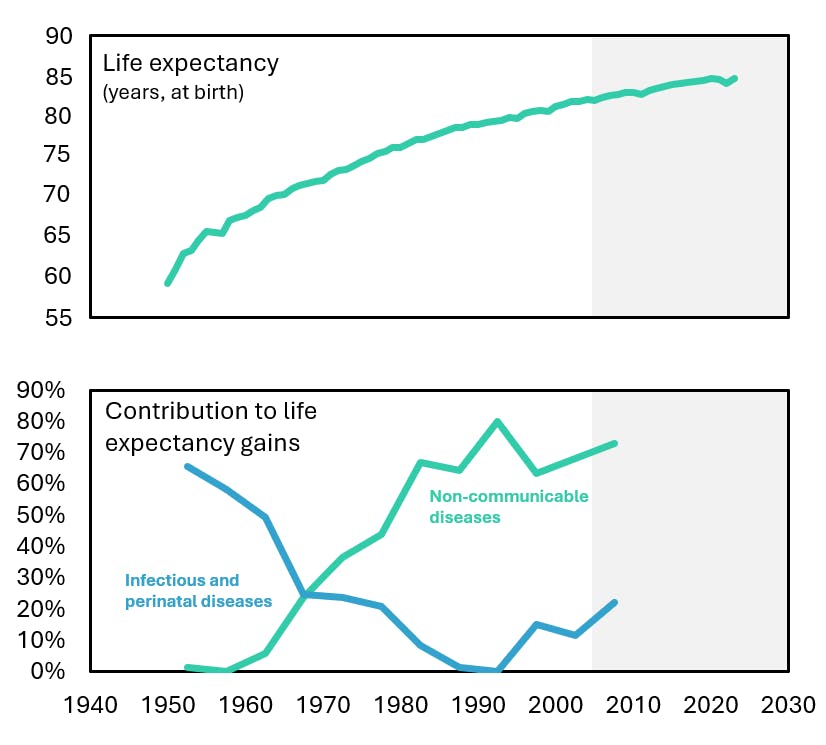 Medellivslängden i Japan har stigit nästan oavbrutet sedan 1950‑talet, men drivkrafterna bakom utvecklingen har förändrats över tid. I början kom merparten av livslängdsvinsterna från färre dödsfall i infektionssjukdomar och perinatala tillstånd, medan de senaste decennierna domineras av vinster från behandling av icke‑smittsamma sjukdomar – typiskt för länder i den andra demografiska transitionen.
