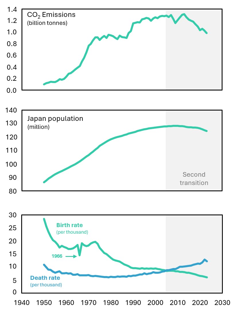Från 1970‑talet började födelsetalen falla och befolkningstillväxten bromsade in. Samtidigt mattades den ekonomiska tillväxten av, delvis till följd av att den japanska börsbubblan sprack. Den andra demografiska transitionen inleddes i mitten av 2000‑talet, när dödstalen översteg födelsetalen och befolkningen började minska. CO₂‑utsläppen började också falla, i takt med att befolkningen krympte.